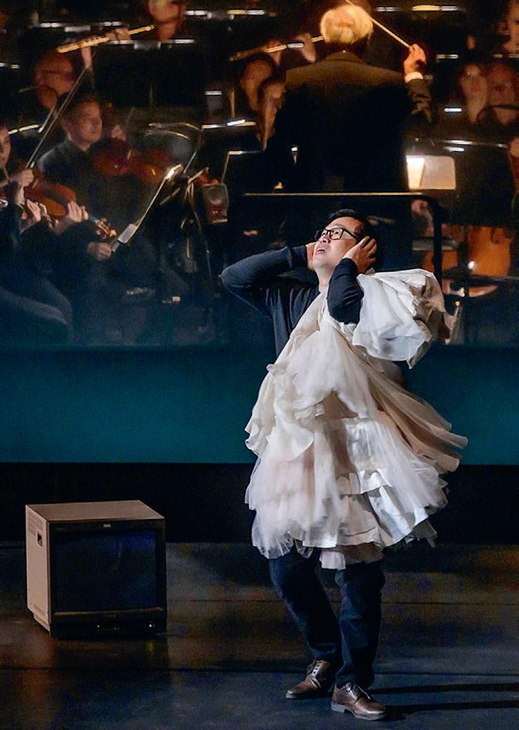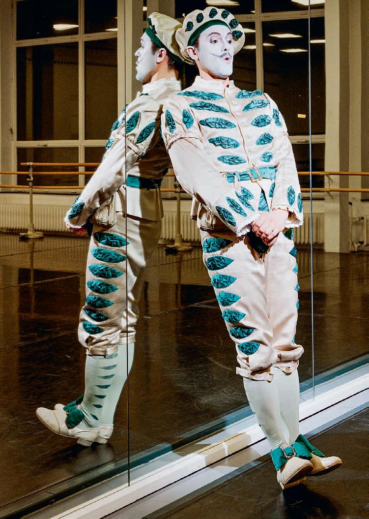 Die Rolle des Figaro ist meine bisher herausforderndste und die, die ich am meisten gesungen habe: In Kopenhagen, in Zürich, in San Diego, allein an der Deutschen Oper Berlin stand ich bestimmt fünfzehn Mal als Figaro auf der Bühne. Die Stimmlage ist durchweg hoch, die Oper ist recht lang, die meiste Zeit davon bin ich auf der Bühne –ich muss also darauf achten, topfit zu sein, sonst spielt schon allein die Stimme nicht mit. Mein Kostüm ist an die Commedia dell’ arte angelegt, es ist extrem bequem und angenehm zu tragen. Meine eigentliche Herausforderung besteht darin, dass ich einen Teil meines Auftritts im Flugwerk verbringe, durch die Luft fliege, aufpassen muss, das Führungsseil nicht ins Gesicht zu bekommen, während ich – singe! Das Publikum hat Spaß und lustigerweise hilft mir sogar die Fliegerei: Oben in der Luft denke ich wirklich an nichts anderes als an meine Atmung, den Gesang und den Moment. Klingt komisch, oder? Ist aber so.