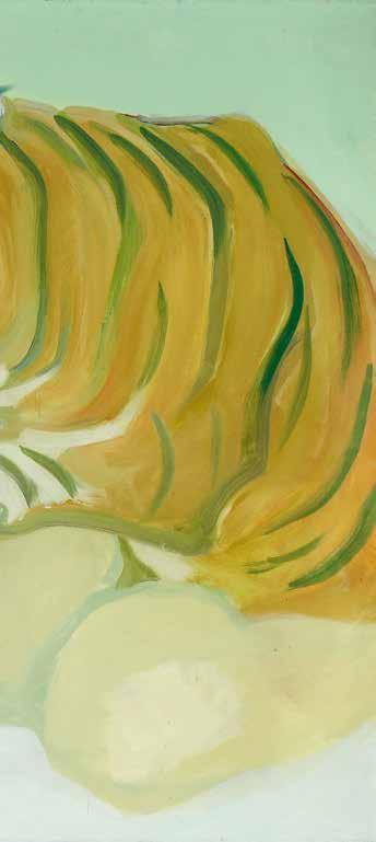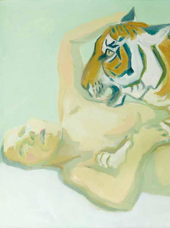 Maria Lassnig: „Mit einem Tiger schlafen“, 1975. Öl auf Leinwand, 106,5 × 127 cm.