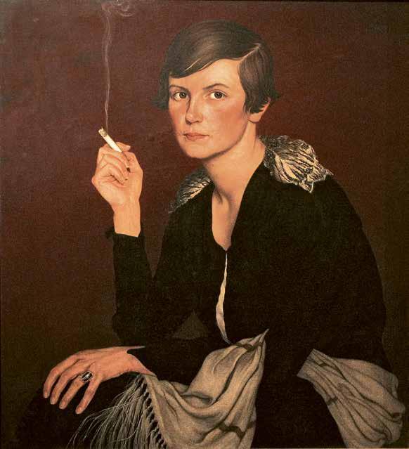 als es verhüllt (Kat. 89). Die Emotionslosigkeit der jungen Frau steht in merkwürdigem Gegensatz zur sexualisierten Aufladung des Motivs. Das Spiel von Verstecken und Enthüllen war Teil des skandalträchtigen Großstadtvergnügens: In dem Berliner Kabarett „Weiße Maus“ beispielsweise war es üblich, sich an der Garderobe eine Maske zu kaufen, wollte man anonym bleiben. Albert Birkles Dame im offenen Wagen stellt die mondäne reiche Frau dar; sie kann sich einen Pelzmantel leisten und ist von einer fragilen Feingliedrigkeit, die nichts von körperlich schwerer Arbeit weiß (Kat. 94). In Italien und England entstanden zeitgleich Gesellschaftsporträts wie die von Achille Funi, Cagnaccio di San Pietro oder Meredith Frampton: Ihre gut situierten Damen in repräsentativem Ambiente sind in einem adäquaten, äußerst glatten, feinen Stil gemalt, der sich an Vorbildern der Renaissance orientiert und stärker den tradierten Konventionen folgt (Kat. 100–102). Äußere Zeichen symbolisierten den Wandel in der Rolle der Frau. Neben Mode und Frisur ist das entscheidende Accessoire die Zigarette, die in den 1920erJahren für Frauen zu einem unverzichtbaren Requisit der Emanzipation wurde, wie Carl Walthers Darstellung beispielhaft zeigt (Kat. 93) – ein Signal für Weltläufigkeit, die oft einherging mit einem Hauch Verruchtheit. Verruchtheit und ein Leben am Abgrund personifizierte wie keine andere die Skandaltänzerin Anita Berber, die Femme fatale par excellence, die von Otto Dix schonungslos dargestellt wurde, gezeichnet von Alkohol- und Drogenkonsum (Kat. 12).