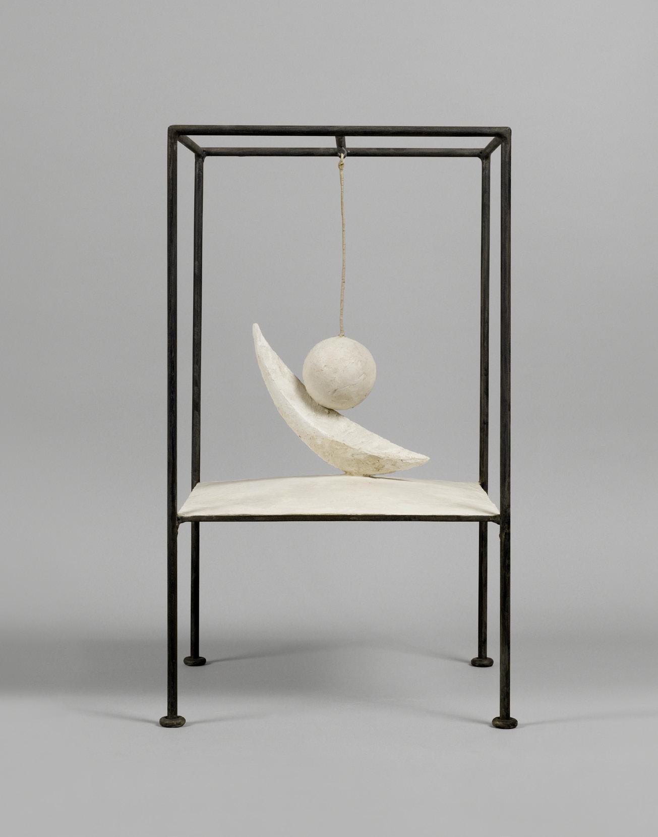 Die Vorkriegsarbeiten Giacomettis aus Paris, die in der Brühler Ausstellung gezeigt werden, die sogenannten „Scheibenskulpturen“ (Kat.-Abb. S. 98–99, S. 101 und 102–103), zeugen von seiner postkubistischen Phase. Die Femme (plate III), die zwischen 1927 und 1929 entstand (Kat.Abb. S. 102–103), kann als eine Auseinandersetzung mit der Figur im Raum verstanden werden.2 Giacometti arbeitete mit geometrischen Körpern, mit Kuben, Quadern und kugelförmigen Elementen. Weiterhin ließ er sich von afrikanischer und ozeanischer indigener Kunst inspirieren, um so eine Vereinfachung und Reduktion der Form zu erreichen, wie es in der Femme-cuillère (1927) (Kat.-Abb. S. 98–99) deutlich wird.3 Doch sah er sich nach wie vor mit dem Problem konfrontiert, den die Skulpturen umfließenden Raum auf adäquate Weise darzustellen. Mit den Gitterskulpturen wie Femme couchée qui rêve (1929) (Kat.-Abb. S. 105) wird der starre Körper aufgelöst, sodass der Raum in die durchbrochene Plastik integriert wird.4 In der Ausführung seiner Skulpturen bleibt für ihn jedoch weiterhin ein Widerspruch, der darin besteht, die starre Figur aus der Wahrnehmung zwischen Raum und Zeit herauszulösen. Mit der Boule suspendue (1930) (Kat.-Abb. S. 109–110) nähert er sich der Lösung dieses Problems, indem er die imaginierte