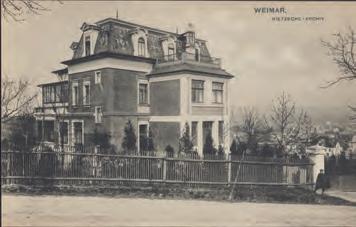 Südwestlich der Innenstadt von Weimar, auf einer Anhöhe mit der schönen Gewannenbezeichnung „Silberblick“, liegt das Nietzsche-Archiv. Von hier aus bietet sich ein weiter Blick über die Klassikerstadt (Abb. 1). In nordwestlicher Richtung ist der Ettersberg mit dem markanten Glockenturm der Ge denkstätte Buchenwald zu sehen, sodass das Nietzsche-Archiv heute in dieser symbolträchtigen topologischen Dreiecksbeziehung steht. Üppig begrünt und mit hohen Laub - und Nadelbäumen umgeben, gehört das Anwesen zu einem in den 1890er Jahren erschlossenen attraktiven Wohnviertel mit repräsentativer Jugendstilarchitektur. Der Bezirksvorsteher August Meisezahl errichtete 1889 /90 den zweigeschossigen Backsteinbau, der zwar unter dem Namen „Villa Silberblick“ bekannt ist, aber eher ein bürgerliches Wohnhaus darstellt.
