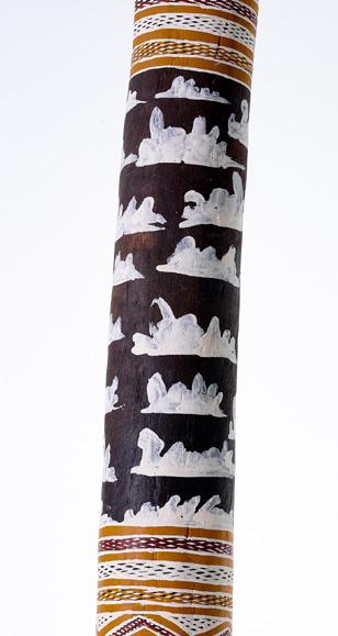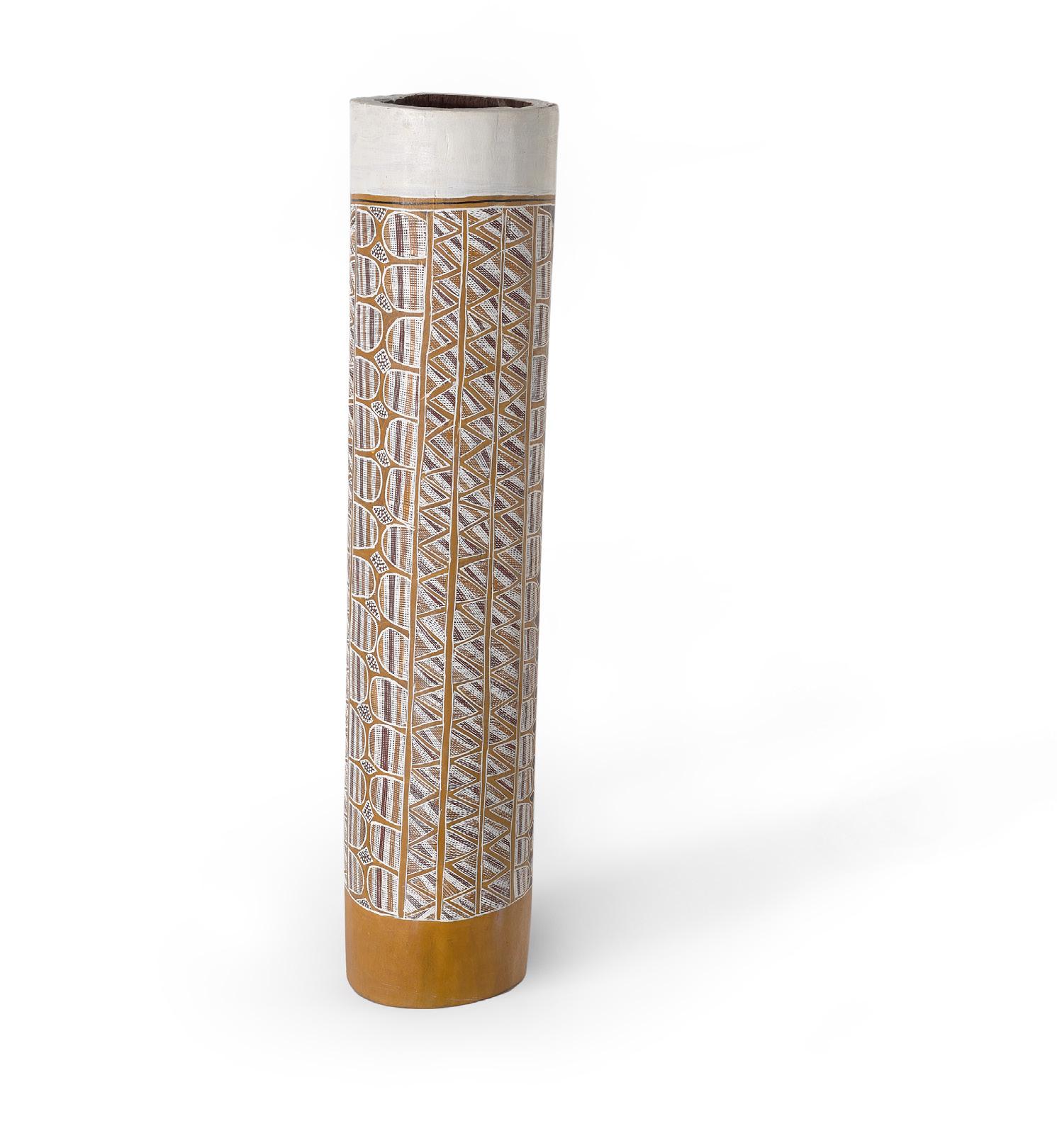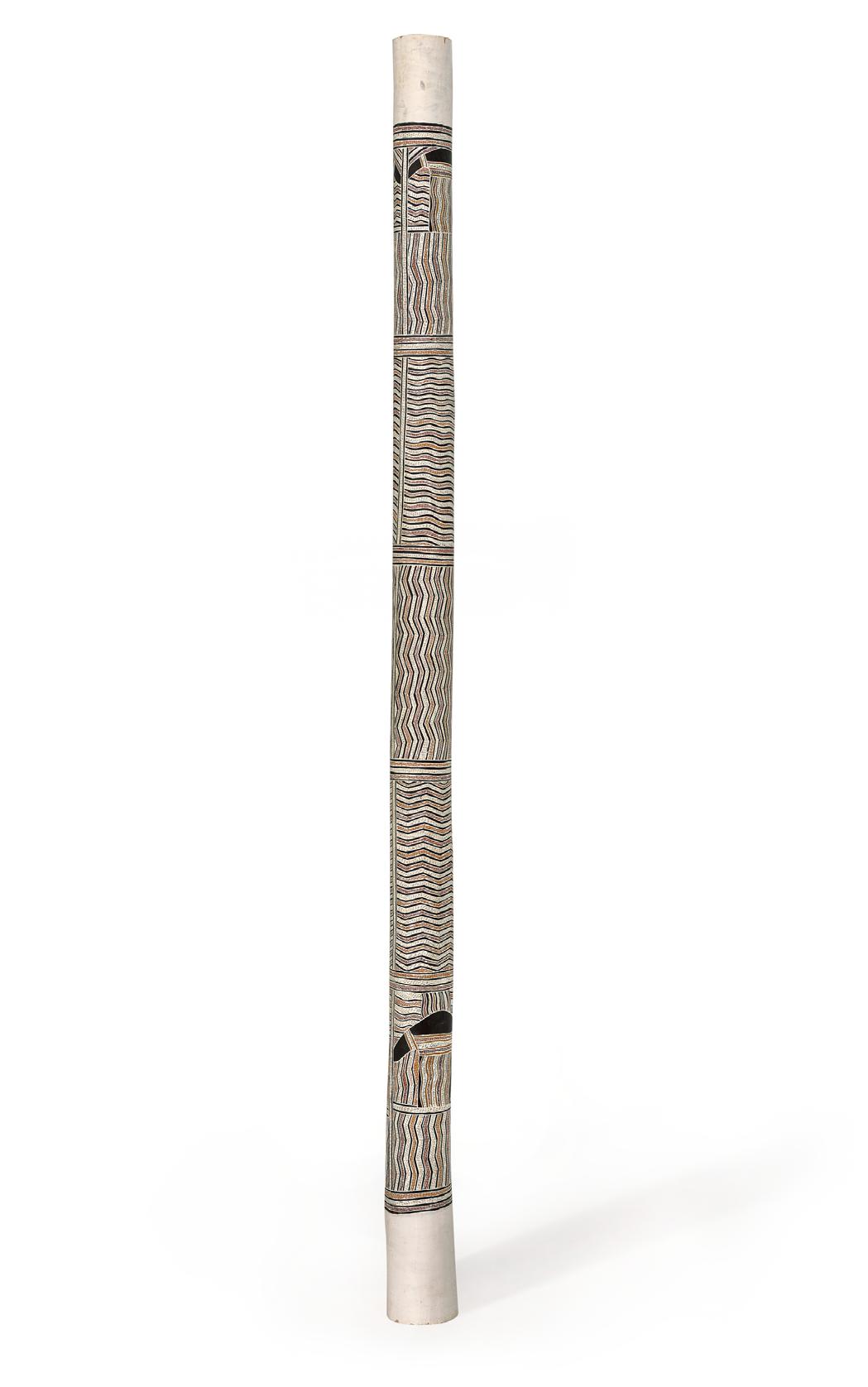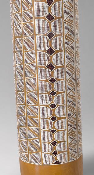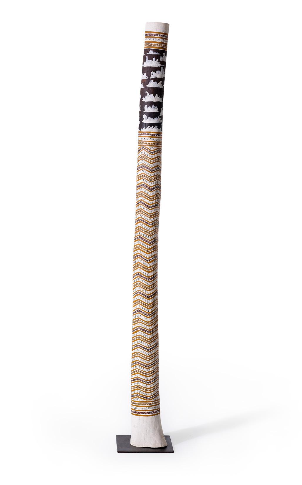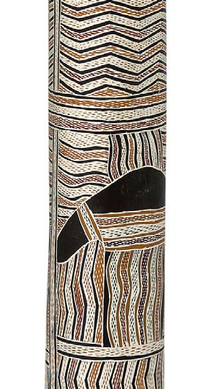 ‘This pole or Dhupun is solely decorated with the Yirritja moiety, Dhalwangu clan saltwater design which denotes Garraparra (known in English as Grindall Bay within the larger Blue Mud Bay).’
