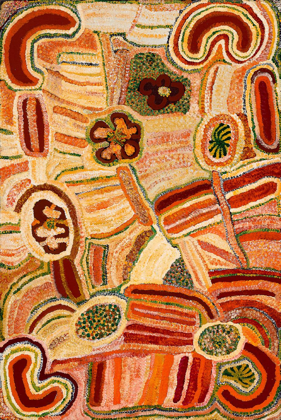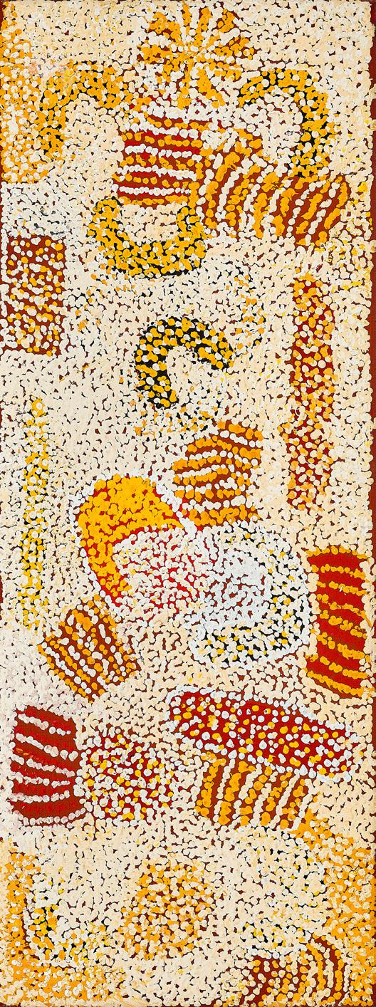 ‘This painting depicts the country known as Parwalla which is Nyumi’s father’s country. This country is south of Balgo in the Great Sandy Desert, west Kiwirrkurra. The landscape of the area is dominated by tali, or sand dunes. The Parwalla area is a swampy area, filling a huge area with water after the wet season rain. These wet season rains result in an abundance of good bush tucker. The majority of the painting shows the different bush foods, including kantjili, or bush raisin, and minyili. Women, the U shapes, with their wana (digging sticks) and coolimons are also depicted. The white colour, which dominates the painting represents the spinifex which grows strong and seeds after the we season rains. These seeds are white in colour and grow so thickly they obscure the ground and other plants below.’