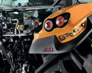 > Multifunktionsarmlehne mit integriertem Joystick für die Steuerung der wichtigsten Traktorfunktionen