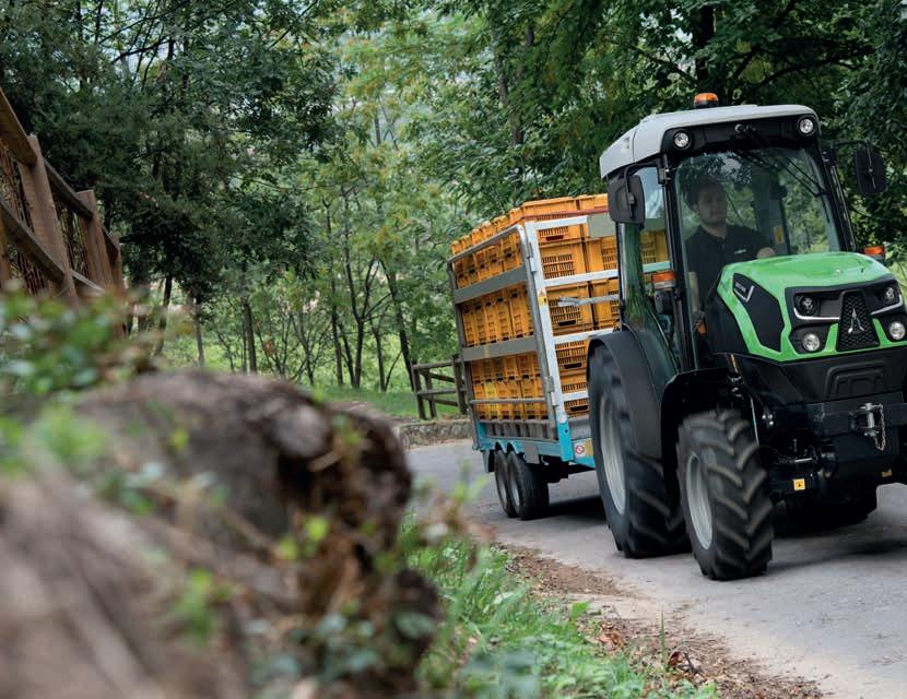 A gestão eletro-hidráulica da ativação da tração dianteira e do bloqueio a 100% de ambos os diferenciais ocorre de série, assegurando o máximo de tração em todos os tipos de terreno. Tal como agora ocorre normalmente, para uma segurança sem cedências em modelos DEUTZ-FAHR especializados, a verdadeira travagem também ocorre de série, graças à presença de discos dos travões nas 4 rodas.