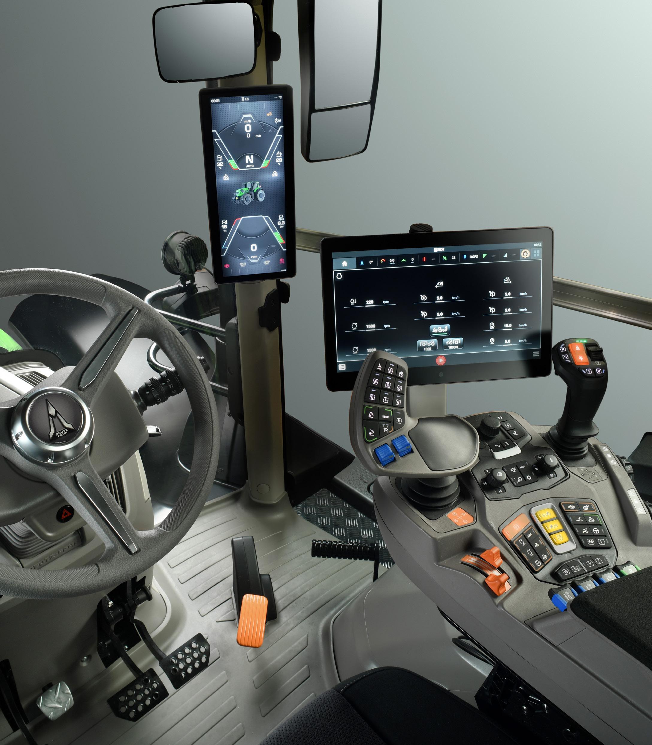 El nuevo reposabrazos iControl integra mandos intuitivos MMI y dos joysticks ergonómicos multifuncionales: el joystick iMotion, con varios botones que se pueden asignar libremente para ampliar el control, y el joystick CrossLever, con una nueva gestión de capas que asegura operaciones precisas, intuitivas y personalizables. Dos pantallas digitales de alta resolución —un iCluster de 15", líder del mercado, en el pilar A y un iMonitor 5 de 12,8" en el reposabrazos iControl— crean una experiencia totalmente digital en una interfaz inteligente que fusiona datos de la máquina, funciones de guiado y ajustes de confort en una interfaz muy intuitiva. El nuevo iSystem permite una integración perfecta de las Smart Farming Solutions, incluyendo Auto Guidance, ISOBUS, XTEND y Telematics. El sistema admite la integración de cámaras digitales y está preconfigurado para DEUTZ-FAHR TAGS (Tractor Assisted Guidance System).