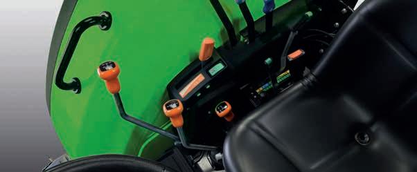 DEUTZ-FAHR se centra siempre en la seguridad y el confort del conductor. El volante y el cómodo asiento se pueden regular según las preferencias personales. Hay mucho espacio para que el conductor pueda moverse libremente, especialmente en la zona de los pies. Los escalones y las sujeciones a ambos lados del tractor te permiten subir y bajar con facilidad. Los mandos se han reorganizado, disponiéndolos de forma lógica en función de la frecuencia de uso y están claramente identificados mediante un código de colores. Cabe destacar la nueva disposición de las palancas hidráulicas, que están en una posición muy ergonómica y cómoda. La pantalla central de información del salpicadero proporciona al conductor información clara sobre las condiciones de funcionamiento del tractor, tanto en formato digital como analógico. La nueva Serie 4E ofrece, como es natural, una vista despejada de todas las áreas de trabajo. El conductor puede verlo todo, lo que lo que se traduce en una mayor eficiencia y seguridad. La nueva alfombrilla de material aislante mejora el confort del conductor y reduce el nivel de ruido, las vibraciones y el calor. Los 5 faros de trabajo iluminan toda el área operativa alrededor del tractor para poder trabajar de noche. Además, el cargador frontal puede equiparse de fábrica con 2 preinstalaciones diferentes (Kit Light o Kit Ready), que se integran perfectamente en la configuración del tractor. Lo mismo ocurre con la palanca PowerShuttle, que está conectada a la regulación del volante y está siempre al alcance.