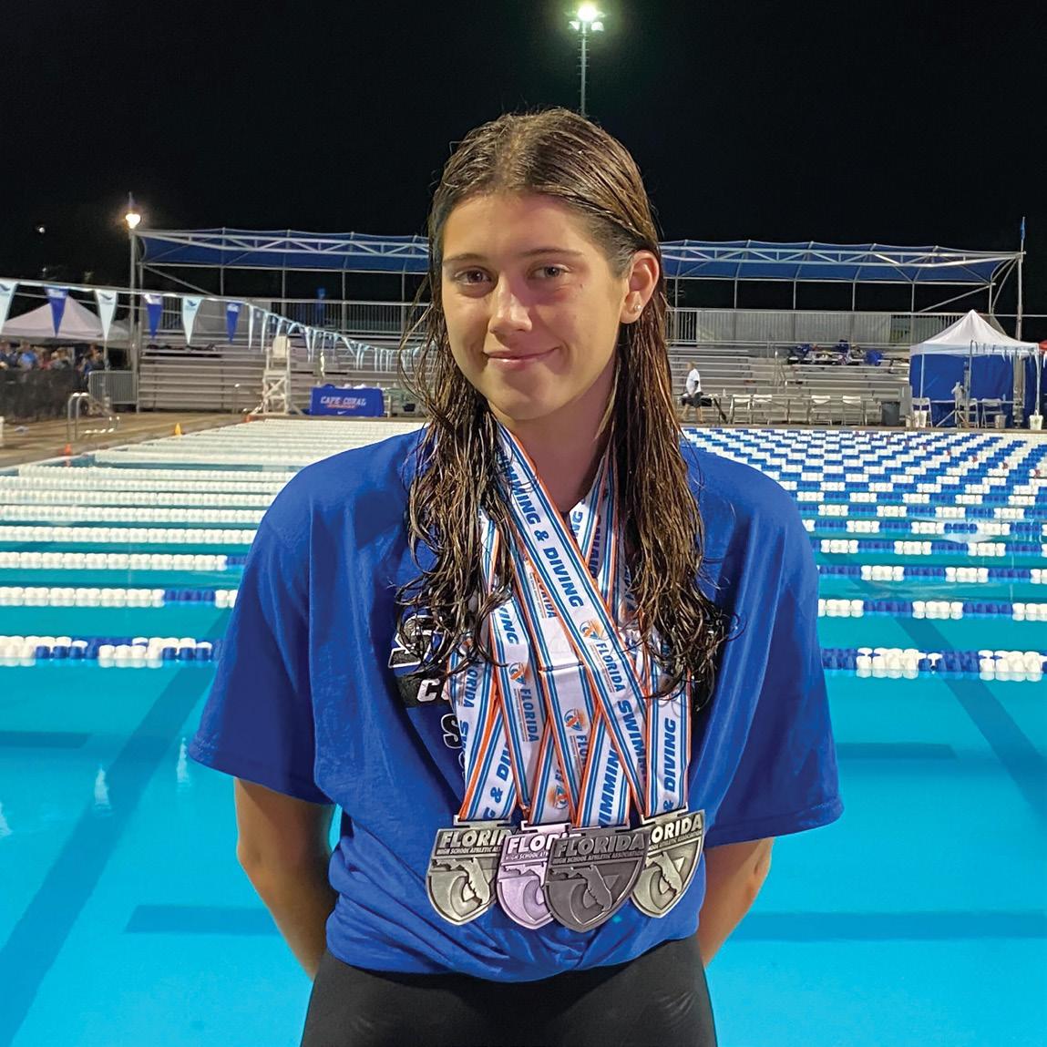 captain Gwyneth Sturm dons numerous medals to honor her record-breaking performance this year in girls swim.