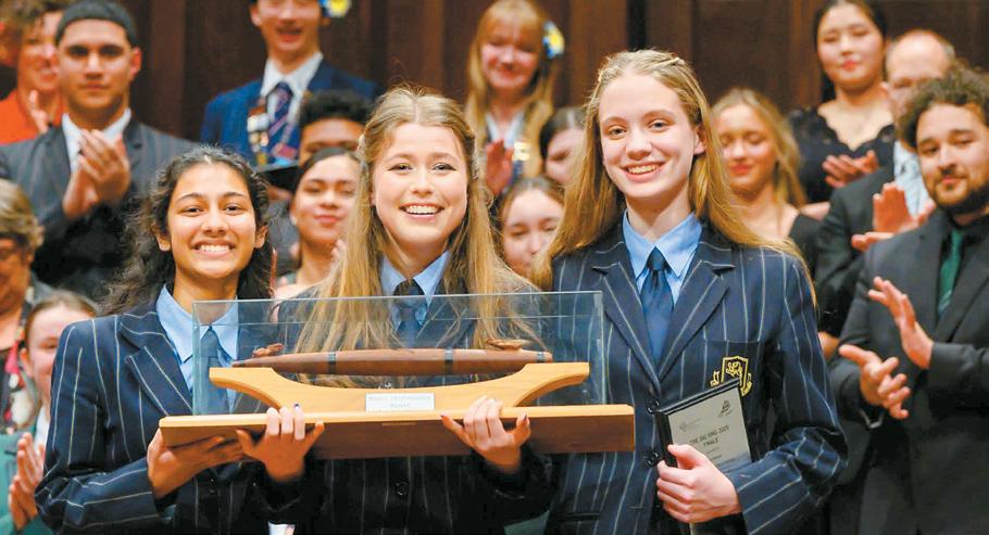 Crowdpleasers... Takapuna Grammar’s (from left) Zara Ahmed, Kaitlyn Darroch and Nina Sinclair with the prize their Leonessa choir won for Best Performance in Te reo Māori at the Big Sing Finale. The choir’s heartfelt version of “Te Iwi E” won media attention and thousands of views online. Full story, pages 38-39.