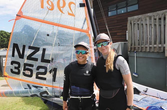 Westlake Girls High School sailors Jess Handley (pictured near right) and Bella Jenkins took the girls’ 29ers fleet title at the 2026 Auckland Secondary Schools regatta.