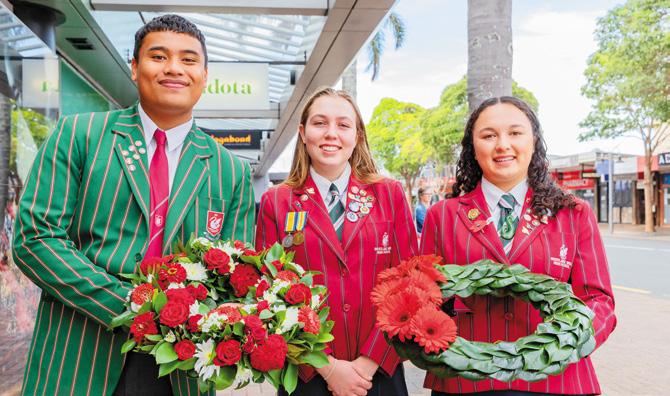 Showing respect.... Westlake Boys High School head boy Constantine Mataafa with Westlake Girls head prefect Julia Wilkins (centre), who read the Anzac Day address, and deputy head prefect Anahera Petera. Carmel College, Rosmini College, Takapuna Grammar School, Takapuna and St Joseph’s primaries and Age School were also involved in the commemoration. More school pictures, page 11.