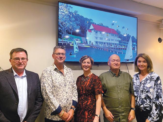 The vision... In front of an image of what a restored clubhouse might look like, members of the Bayswater Restoration Governance Committee (from left) are: Takapuna Boating Club board member Mark Wooster, club vicecommodore Darren Moore, commodore Wendy Baker, president Barry Ward and volunteer Nicole DeSonier, who helped shape the fundraising video.