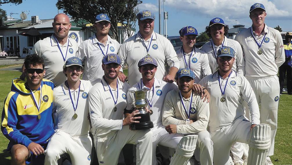 Takapuna (pictured with their trophy) took first-innings points to clinch the title at home against East Coast Bays on March 21. Chasing the visitors’ 175 all out, Takapuna reached 186/8 at the end of the second day.