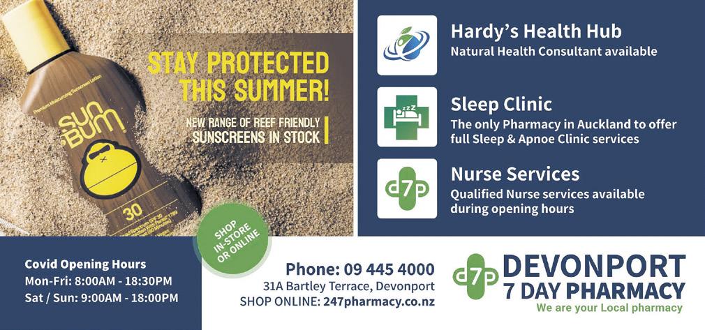NEXT ISSUE: December 2 ADVERTISING DEADLINE: November 25 MANAGING EDITOR: Rob Drent PUBLISHER: Peter Wilson CHIEF REPORTER: Janetta Mackay DESIGN: Brendon De Suza COPY EDITOR: Jo Hammer Devonport Publishing Ltd First Floor, 9 Wynyard St Telephone: 09 445 0060 Email: sales@devonportflagstaff.co.nz news@devonportflagstaff.co.nz Website: www.devonportflagstaff.co.nz Information in the Devonport Flagstaff is copyright and cannot be published or broadcast without the permission of Devonport Publishing Ltd NZ COMMUNITY NEWSPAPER AWARDS Best Community Involvement: 2021, 2016, 2014, 2012, 2011, 2010, 2008, 2005 Best Special Project/Supplement: 2016, 2020 VOYAGER/CANON MEDIA AWARDS Community Reporter of the Year: Winner 2018 Community Newspaper of the Year: Finalist 2017