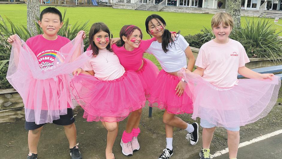 They wore it well... Milford School Year 6 pupils (from left) Ryan Feng, Lily Drury, Amelia TremainChoudhary, Janice Dong and Ethan Rootman were among those who wore pink on 19 May as part of Pink Shirt Day,