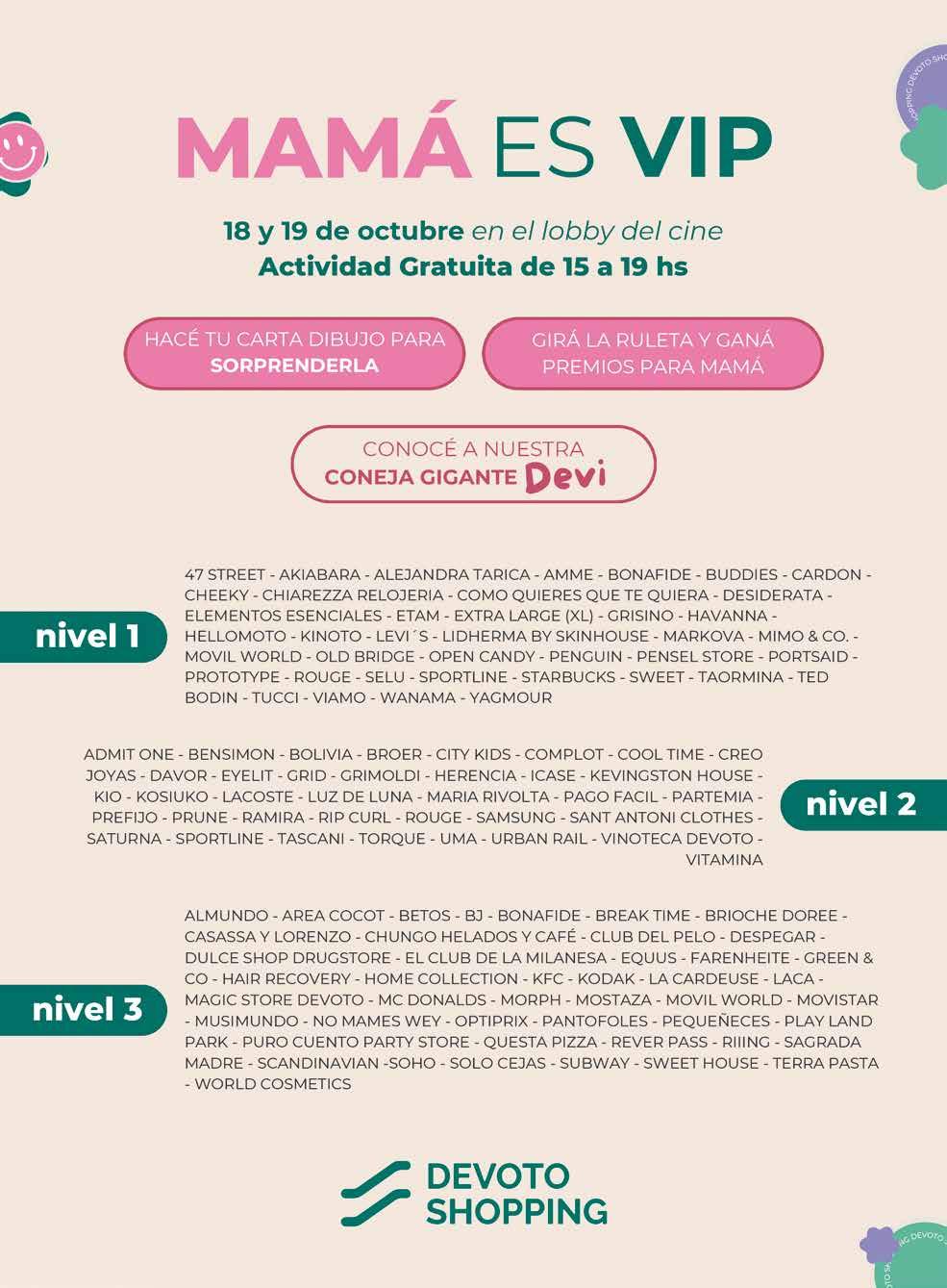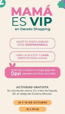 Los podes descargar ingresando a www. devotoshopping.com.ar seleccionas tu cupones de tu marcas y te llega a tu email Así de fácil. Consultá todas las formas de pago en los locales. Adelantante y ahorrá en en regalo para mamá. Una propuesta mas, si pasas por el Shopping del 14 al 20 de Octubre vas a poder conocer a la coneja Devi y sacarte una foto con ella, tambien el 18 y el 19 hay una actividad gratuita donde podrán hacer cartas y dibujos para mamá, y participar para girar la ruleta y ganar premios sorpresas!!! Todo en el lobby del cine.