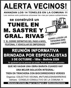 Los asistentes expresaron que dividirá la zona en dos, cuestionan su impacto y exigen alternativas integradoras y estudios de impacto ambiental • El grupo de Vecinos autoconvocados “nitunelesnibarreras”, con el apoyo del Consejo Consultivo de la Comuna 11, organizó esta reunión informativa. + P12.