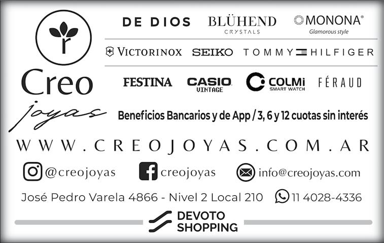 El local Creo Joyas se encuentra en Devoto Shopping Nivel 2 local 210 desde hace varios años, en esta nota cuentan su elección por la marca De Dios Joyas: “Hace casi diez años decidimos incorporar en nuestro comercio a De Dios Joyas, nos pareció excelente la calidad y el diseño de sus productos”.