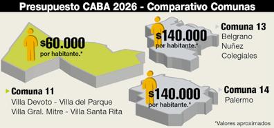 Tras su aprobación en la Legislatura porteña corresponde preguntarse: ¿Fue justo el reparto de la inversión para el Presupuesto 2026 en CABA? Mientras Palermo, Belgrano, Nuñez y Colegiales recibirán una inversión de $140 mil por habitante, la Comuna 11 quedó en un valor promedio de $60 mil, menos de la mitad que los habitantes de esos barrios. +Info P8