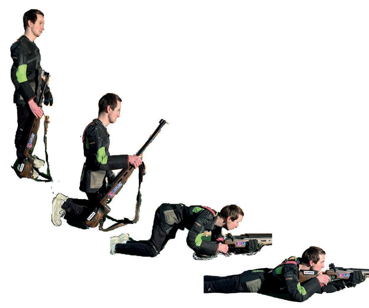 Alle skal skyte 5 skudd. De skal starte i oppreist stilling med våpenet festet i reim til armen og legge seg rolig ned på ild. De kan sette inn magasiner etter at de har lagt seg ned. Skytterne reiser seg opp og legger seg ned mellom hvert skudd. Magasin skal ut og sluttstykket skal være i bakre stilling når de reiser seg.