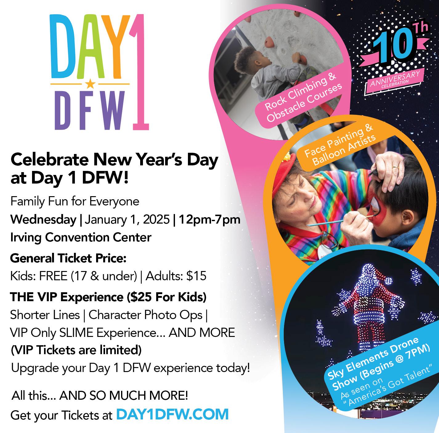 Day 1 DFW is North Texas’ largest family-friendly New Year’s Day event, featuring bounce houses, arts and crafts, obstacle courses, live entertainment and a stunning drone show finale to kick off your year in style! See ad on page 7.