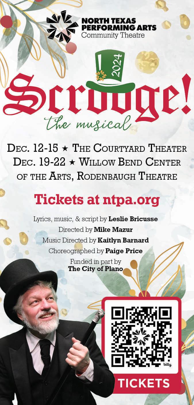 Experience the magic of theatre! NTPA's annual production of Scrooge the Musical runs December 11–22. Find dozens of performances, camps and youth auditions monthly at NTPA's five locations: Plano, Fairview, Frisco, Dallas and Southlake. See ad on page 62.