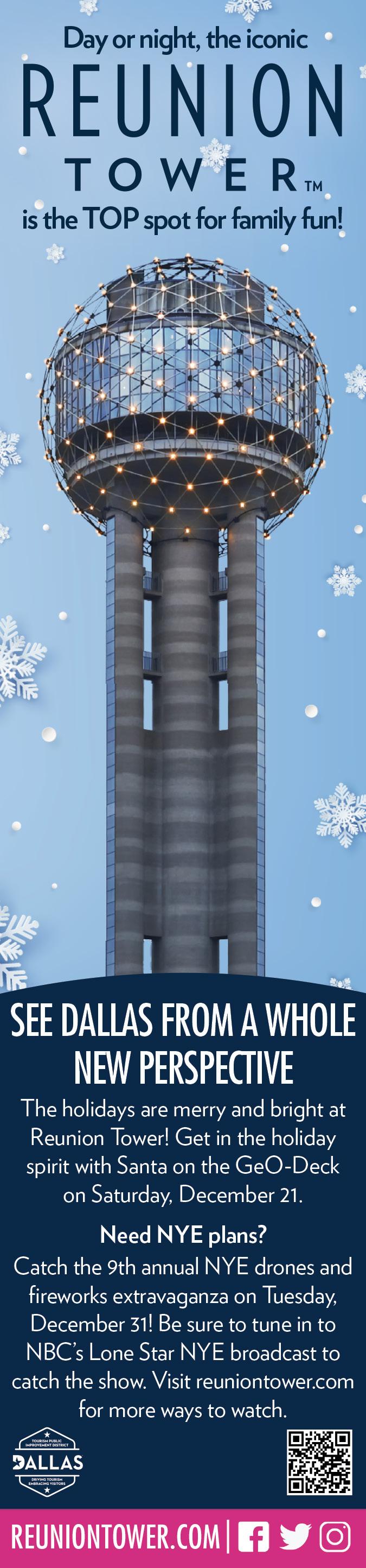 The holidays are merry and bright at Reunion Tower! Get in the holiday spirit with Santa on December 21 and catch the annual NYE drones and fireworks extravaganza on December 31. Visit reuniontower.com for details. See ad on page 6.