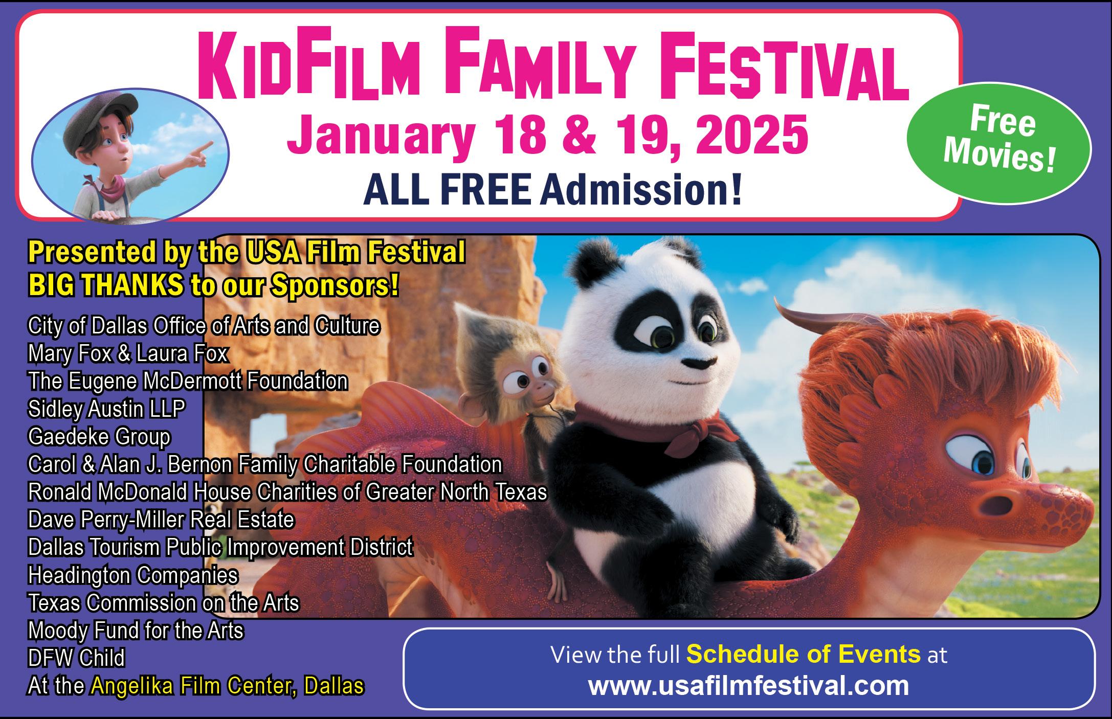 It's back! The all-free-admission KidFilm Family Festival will take place on Saturday and Sunday, January 18–19, 2025, at Angelika Dallas. Featuring appearances by children’s book authors and new films for all ages. usafilmfestival.com See ad on page 57.