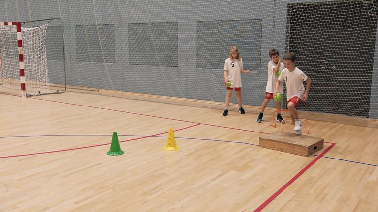 den første hæk med én bold hver De hopper med to fødder over hækkene, hinker over stepbænken, sætter af og afslutter med skud på mål.
