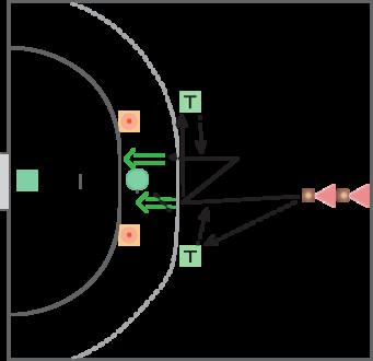 Simpel opstilling med zone på målcirklen afgrænset af to kegler og en enkelt forsvarer Spillerne modtager bolden i løb og i en afstand til forsvareren, der gør det muligt at sætte en skudtrussel ind. Efter skudtrussel finter spilleren og forsøger et gennembrud.