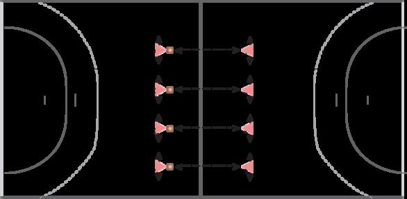 Spillerne deles, så de er sammen parvis, hvorefter de to spillere i et par deles, så de er på hver sin side af hallens midterlinje. I øvelsen skal de blive på hver sin banehalvdel men må til gengæld bevæge sig frit på den banehalvdel, hvor de er placeret