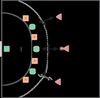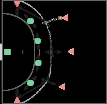forsvarsspillere, der placeres på målcirklen, hvor der markeres med fire stykker tape/kegler, så der er tre rum på målcirklen. En forsvarsspiller placeres i hver sin zone. Tre angribere er sammen om en bold og skal score ved gennembrud eller skud. Hver angriber har en zone de kan angribe i, så der på denne måde er en duel én mod én i hver af de tre zoner.
