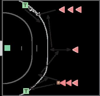 Venstre back modtager bolden fra fløj og er i bevægelse mod mål. Afleverer til playmakeren, som stempler på og afleverer videre til højre back, som angriber udad og afleverer til fløj. Fløj afleverer hurtigt til næste back i rækken, der presser bolden retur mod playmaker