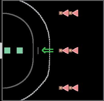 Et område af målcirklen afgrænses af to kegler så en zone er markeret midt på målcirklen. Området dækkes af to forsvarere. En tilspiller på venstre fløj sætter øvelsen i gang med et til-spil til venstre back, der modtager bolden i løb, angriber på ydersiden af forsvareren og afslutter, hvis det er muligt. Ellers spilles bolden videre til playmakeren, der angriber på det frie rum mellem de to forsvarere. Der afsluttes eller spilles videre til højre back, som så skal komme til afslutning. Bolden må ikke spilles retur fra hverken playmaker eller højre back.