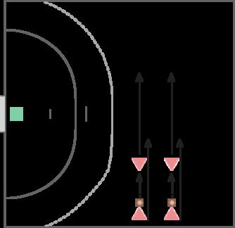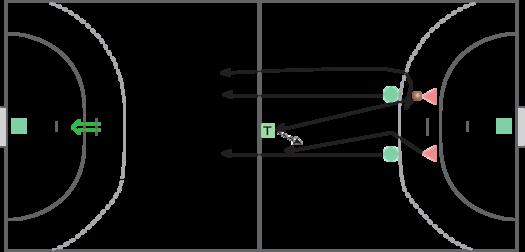 målcirkel med bolden, mens de to forsvarere starter tre meter derfra med fødderne på tremeterlinje. En tilspiller står i banens midtercirkel og øvelsen sættes i gang ved at angriber kaster bolden til tilspiller. Angriberne løber fri og modtager bolden fra tilspiller på midten, mens de to forsvarere laver returløb og vurderer, hvordan de bryder angrebet ved enten bolderobring eller ved at lukke angriber ned til et frikast.
