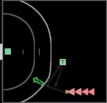 Simpel opstilling med zone på målcirklen afgrænset af to kegler og en enkelt forsvarer. Spillerne modtager bolden i løb og i en afstand til forsvareren, der gør det muligt at sætte en skudtrussel ind. Efter skudtrussel finter spilleren og forsøger et gennembrud.