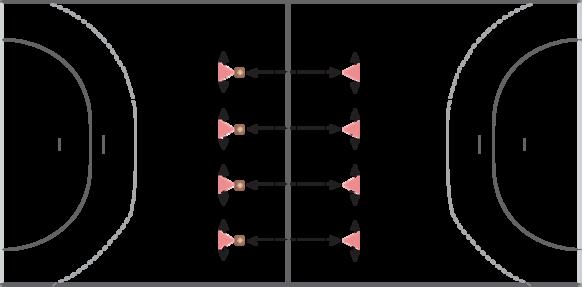 ØvelseSpillerne deles, så de er sammen parvis, hvorefter de to spillere i et par deles, så de er på hver sin side af hallens midterlinje. I øvelsen skal de blive på hver sin banehalvdel men må til gengæld bevæge sig frit på den banehalvdel, hvor de er placeret. Et par har en bold og skal lave afleveringer på tværs af midten. De må ikke drible, og en spiller må maks stå med bolden i tre sekunder, før der afleveres til makker på den anden banehalvdel. På samme tidspunkt, som et makkerpar skal holde deres egen bold i gang uden at blive dømt for tid, skal de se, om det er muligt at bryde en aflevering for et af de andre par ved at gå imellem og slå bolden væk.
