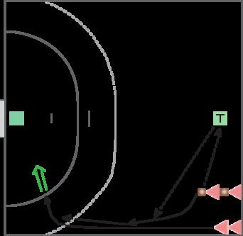 Tre angribere og tre forsvarere. Et område på målcirklen afgrænses af to kegler. Angriberne fordeler sig med to bagspillere og én indløbende spiller. Angrebsspillet er frit, og opgaven for forsvarerne er hele tiden at afklare ansvarsfordelingen, så der er enighed om, hvem der skal frem til den boldførende spiller, og hvem der skal sikre mod indspil til den indløbende spiller.
