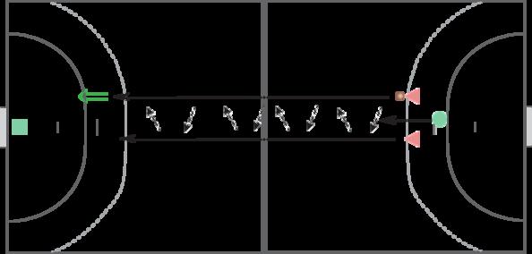 To spillere skal fra egen tremeterlinje spille bolden frem til scoring i modsatte mål uden at drible. En forsvarer starter i målfeltet og jagter de kontraløbende spillere og forsøger at komme imellem og hindre en aflevering, før de er nået til afslutning.