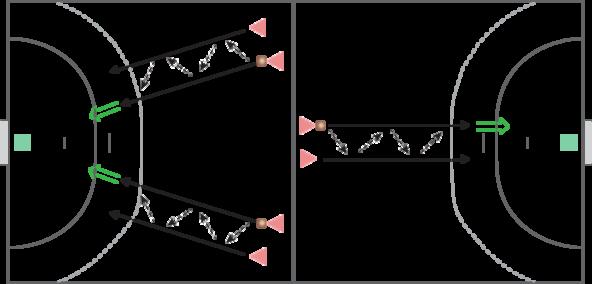 I situation 2:1 er det vigtigt, at spillerne har fokus på at angribe på kant af forsvarer og ikke med løb lige imod den forsvarende spiller. Hele den opsatte zone skal udnyttes, og det gøres ved, at de to angribere løber på hver sin kant af forsvarer.