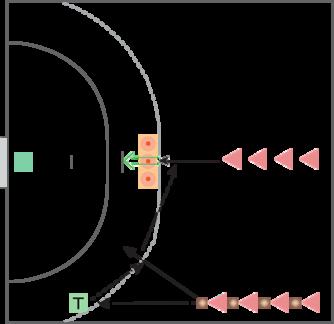 Begynder sit løb frem mod mål og får en aflevering, hvor der presses mod mål, og mens dette pres fastholdes med retning og trussel, begynder playmaker sit løb og modtager en aflevering fra venstre back. Der er opsat tre kegler ca 8 meter fra mål, og det er opgaven for playmaker at løbe ind i afleverin- gen fra back og hurtigt derefter lave et hopskud med spring over de opsatte kegler