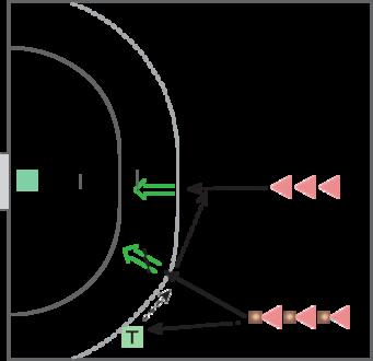 En kegle stilles på gulvet, og en forsvarer stiller sig ca. en halv meter foran keglen. Tre angribere har en bold og stiller sig i en trekant med hver spiller placeret som udgangspunkt 3 meter fra keglen. De tre spillere skal spille bolden mellem sig og skal, når de vurderer, der er plads, forsøge at ramme keglen.