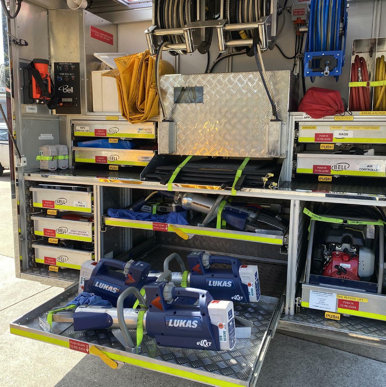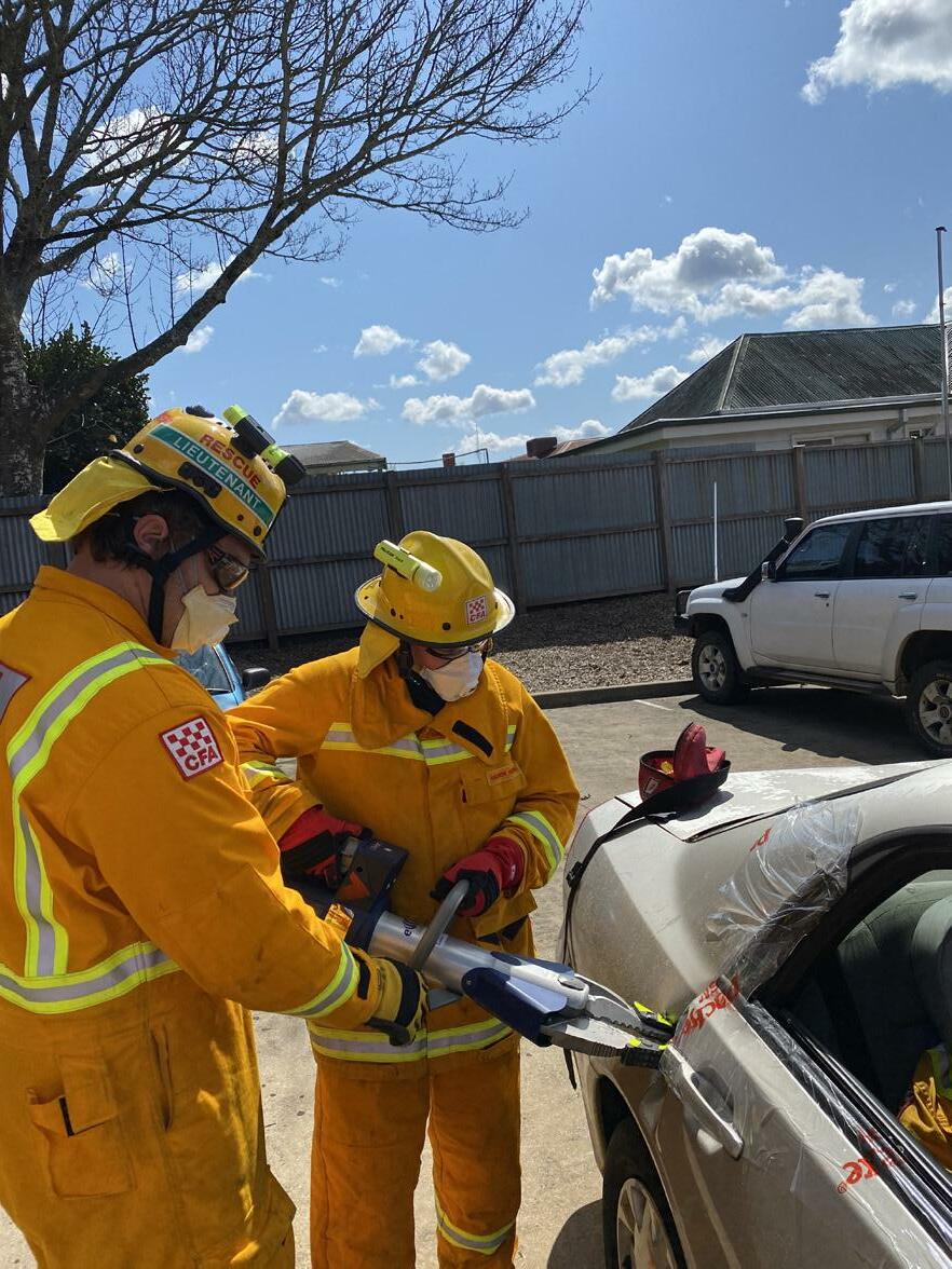 Above, Lieutenant Rikki Yanner, left, and firefighter Andrew Sheerin, make their way into a car at the Daylesford CFA