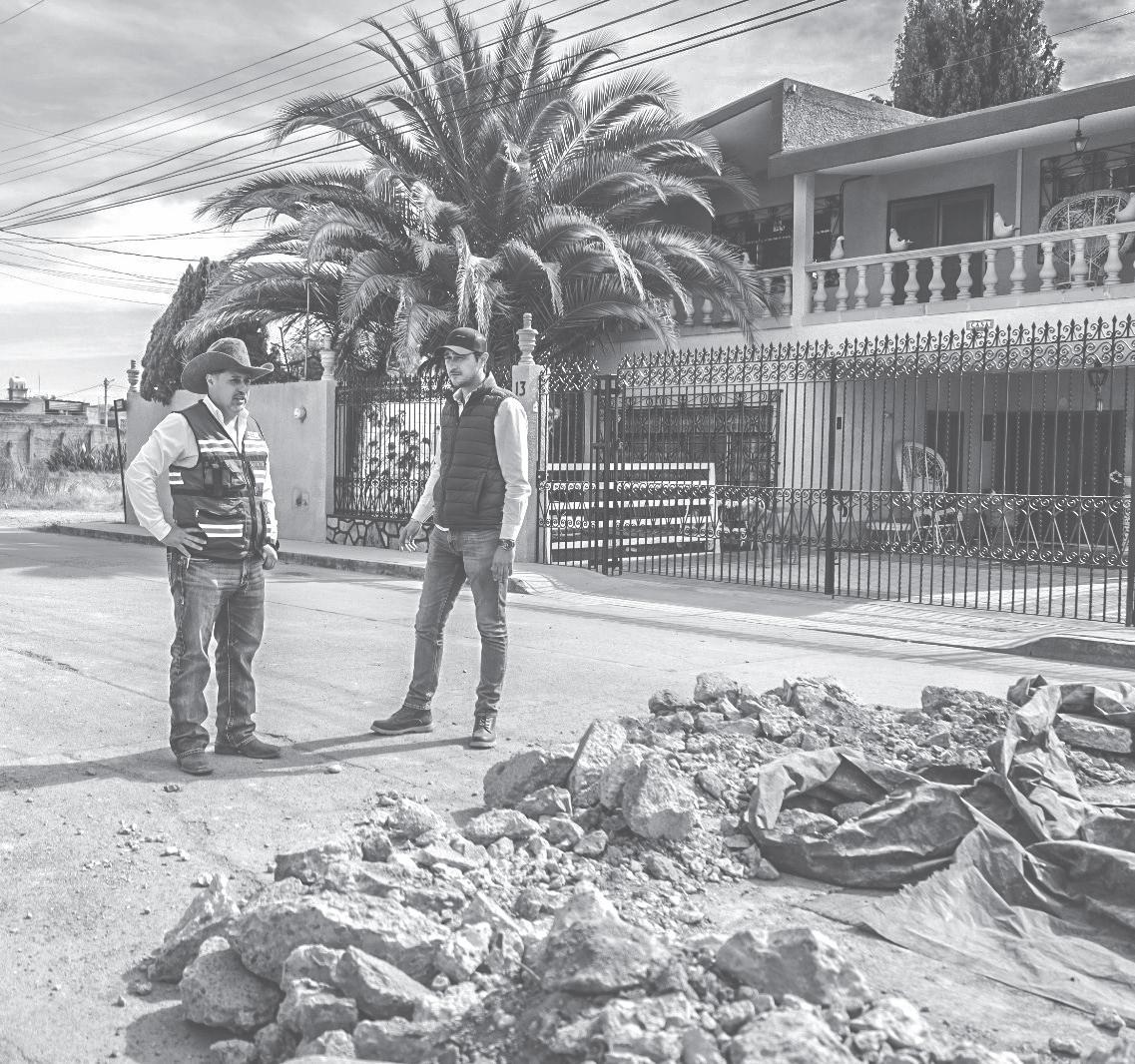 En la calle El Ranchito, además del bacheo, se realizan trabajos de alumbrado público que contemplan mantenimiento preventivo y cambio de luminarias para incrementar la visibilidad nocturna y reforzar la seguridad en esa zona.