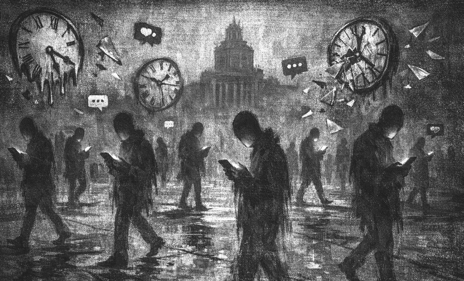 El tiempo se fragmenta entre atender notificaciones, en tanto que la atención se dispersa en múltiples ventanas abiertas y la conversación presencial compite continuamente con la atención que demandan los dispositivos y redes sociales.