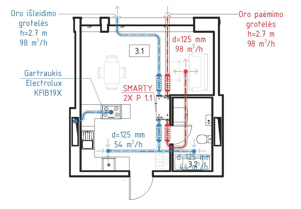 • Projektiniai vidaus oro parametrai: Šiluminio komforto parametrai Normuojamos vertės Šaltuoju laikotarpiu Šiltuoju laikotarpiu Vidaus oro temperatūra, oC 18-22 18-28 Temperatūrų skirtumas 1.1 m ir 0.1 m aukštyje nuo grindų, oC ≥ 3 ≥ 3 Santykinė oro drėgmė, % 35-60 35-65 Oro judėjimo greitis, m/s 0.05-0.15 0.15-0.25