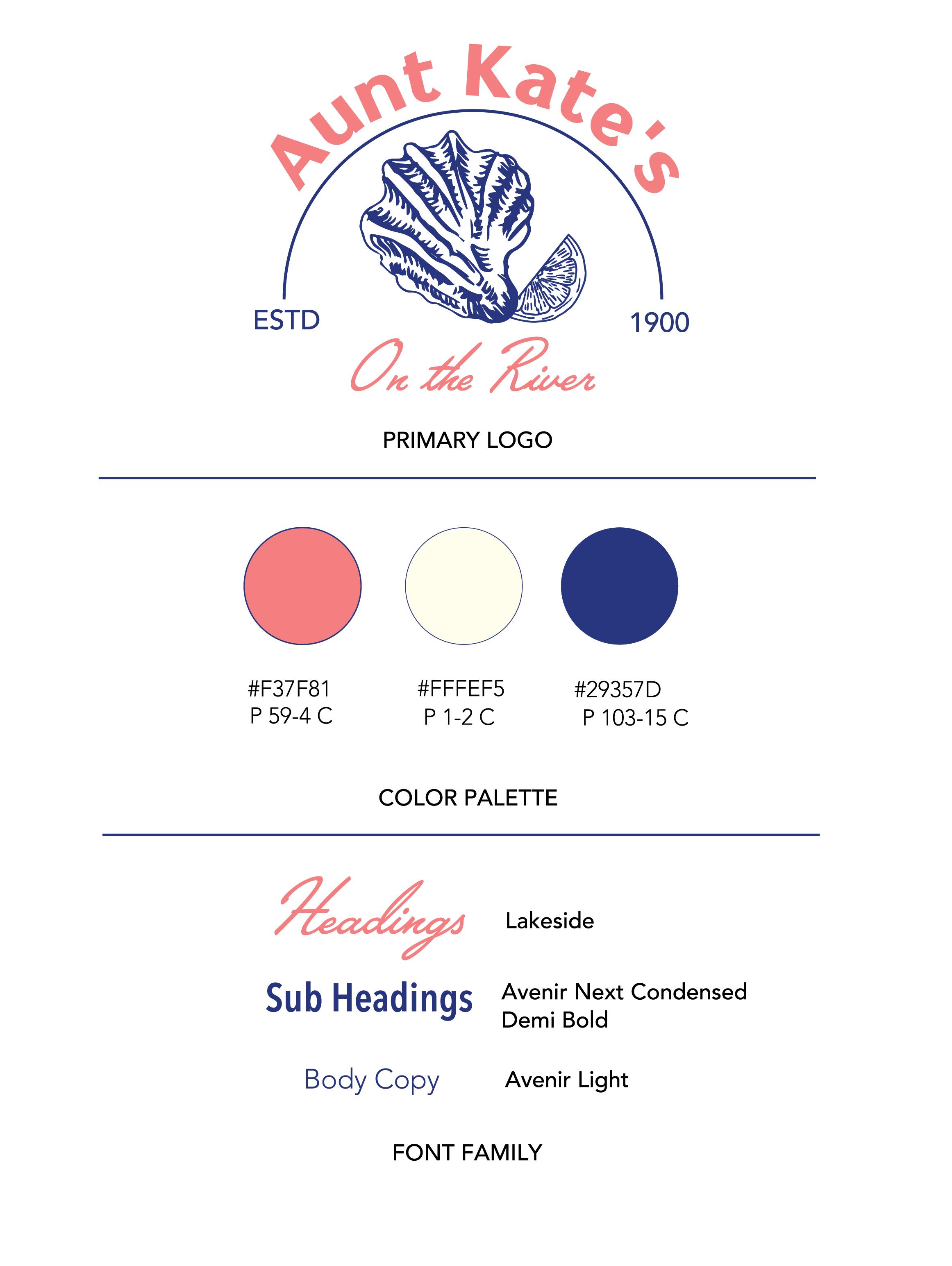Aunt Kate’s is a local restaurant located on the Tolomato River. This restaurant has over 100 years of history that are reflected throughout the building. The re-branding of this restaurant is meant to maintain the nautical themes as they are located on the water, while adding a more modern style. The history of the oyster is also important to the restaurant, as this was a trademark to their business early on. Thus, this new logo and branding maintains the history of the restaurant and adds a stylistic manner to the brand.