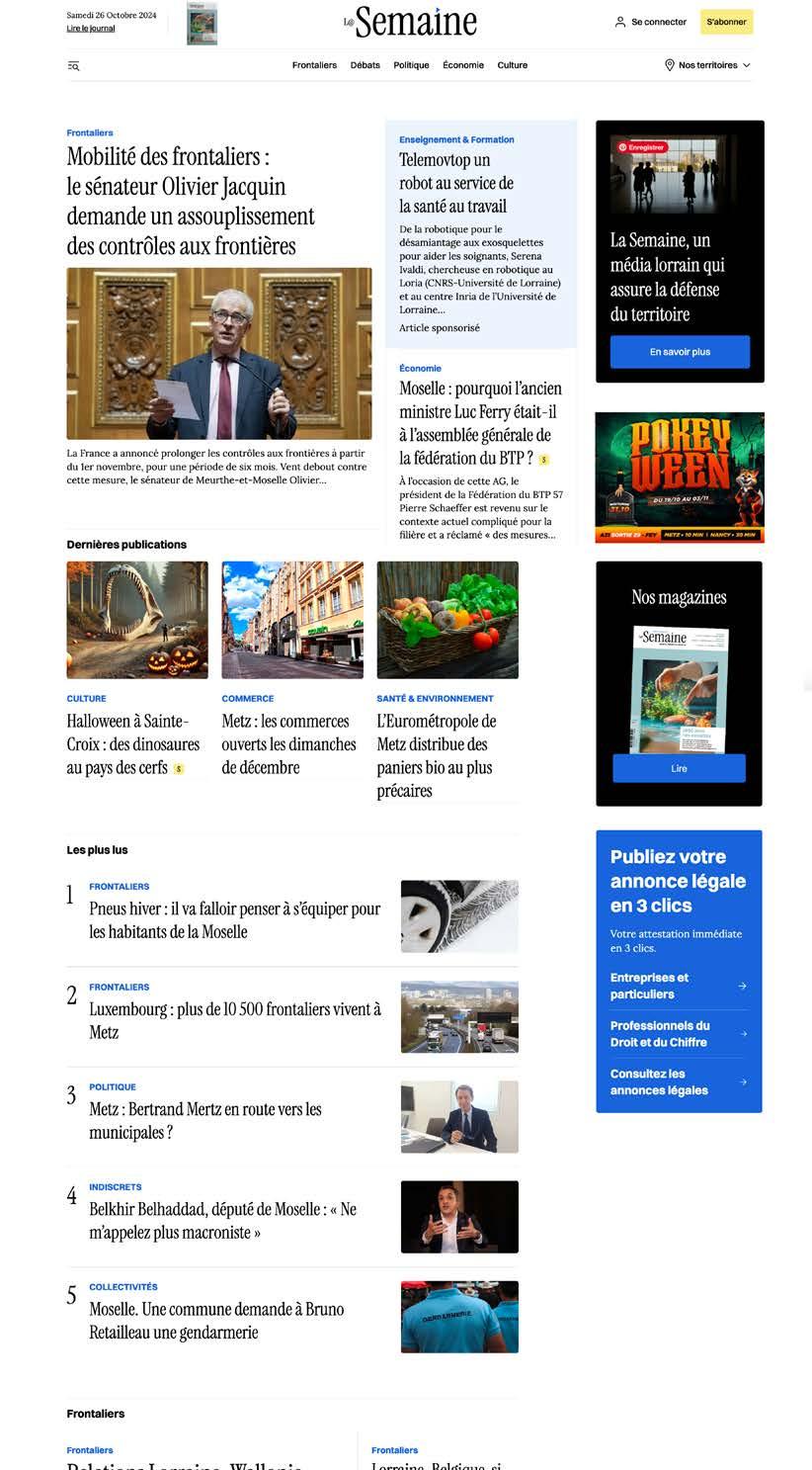 comptes Facebook, Twitter puis LinkedIn. Suivra l’application mobile iOS et Android pour lire l’hebdo sur sa tablette ou son smartphone. Aujourd’hui, le numérique est bien sûr placé au centre de la stratégie du Groupe La Semaine. Preuve en est la refonte totale du site lasemaine.fr opérée en octobre 2024, devenu un véritable site d’informations et d’analyse. C’est d’ailleurs à partir de sa charte graphique qu’a été réalisée la maquette du nouveau format de l’hebdomadaire. Une révolution copernicienne en quelque sorte.