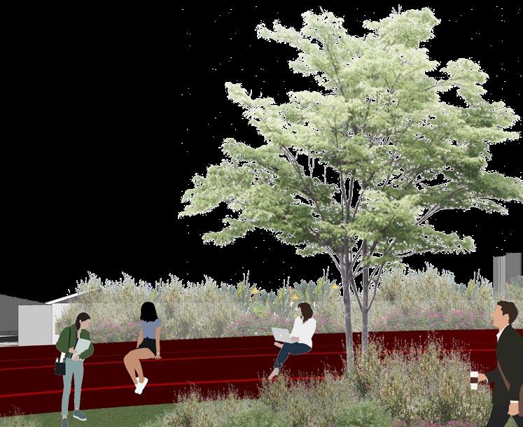 In addition to the green area provided by planter box structures, the space will also include facilities for seating, a mini library, and a temporary booth. These amenities will serve as spaces for various temporary activities, enhancing the functionality and versatility of the area.
