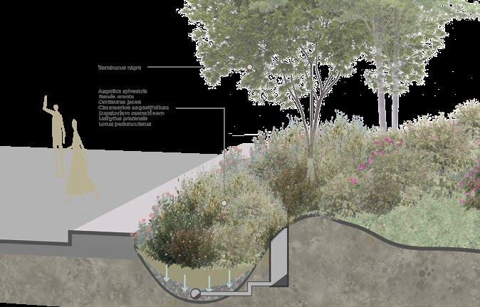 The selection of planting species plays a crucial role in managing rainwater runoff and ensuring water quality. Native plants and those specifically chosen for their water-holding capacity will help reduce the volume of rainwater reaching the creek. These plants will also contribute to the naturalization and purification of the water, enhancing the overall sustainability of the site.